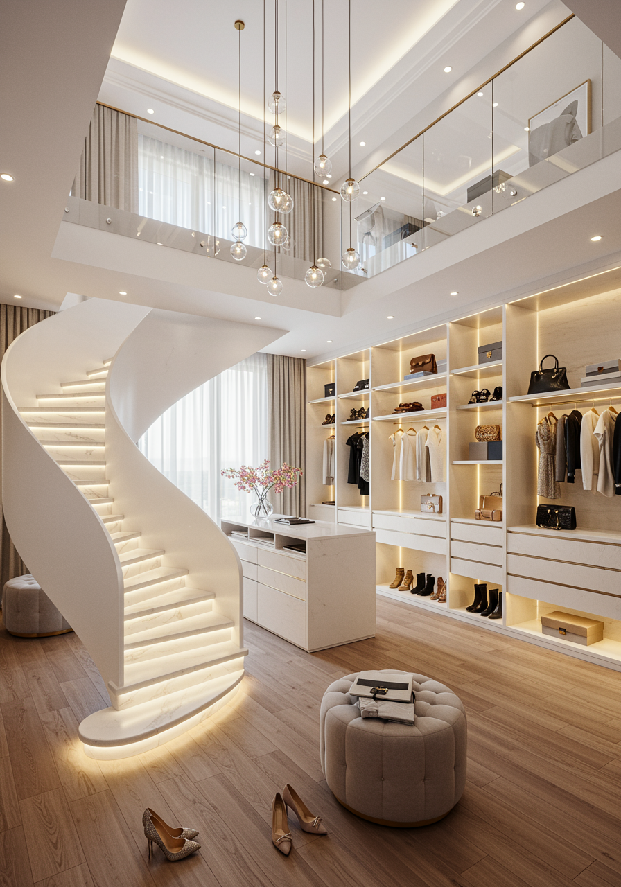 Coming from a hotel background, the best way I can describe the primary bedroom is presidential. It’s completely open concept, and the closets are divine. One of the closets was inspired by (UK-based design house) Ted Baker and has lovely, luxurious European influences in neutral tones that work well with the desert color palette. The other two-level closet was inspired by the (now closed) Barneys on New York’s Upper East Side. I really wanted it to feel like when you’re getting dressed each day that you were shopping in a Barneys. There’s a place for your handbags, shoes and jewelry—we even installed a small laundry unit so the owner has access to their delicates in the privacy of their own closet. The spiral staircase leads up to a champagne deck with lounges, glass railings and views of the city. It’s absolutely stunning.