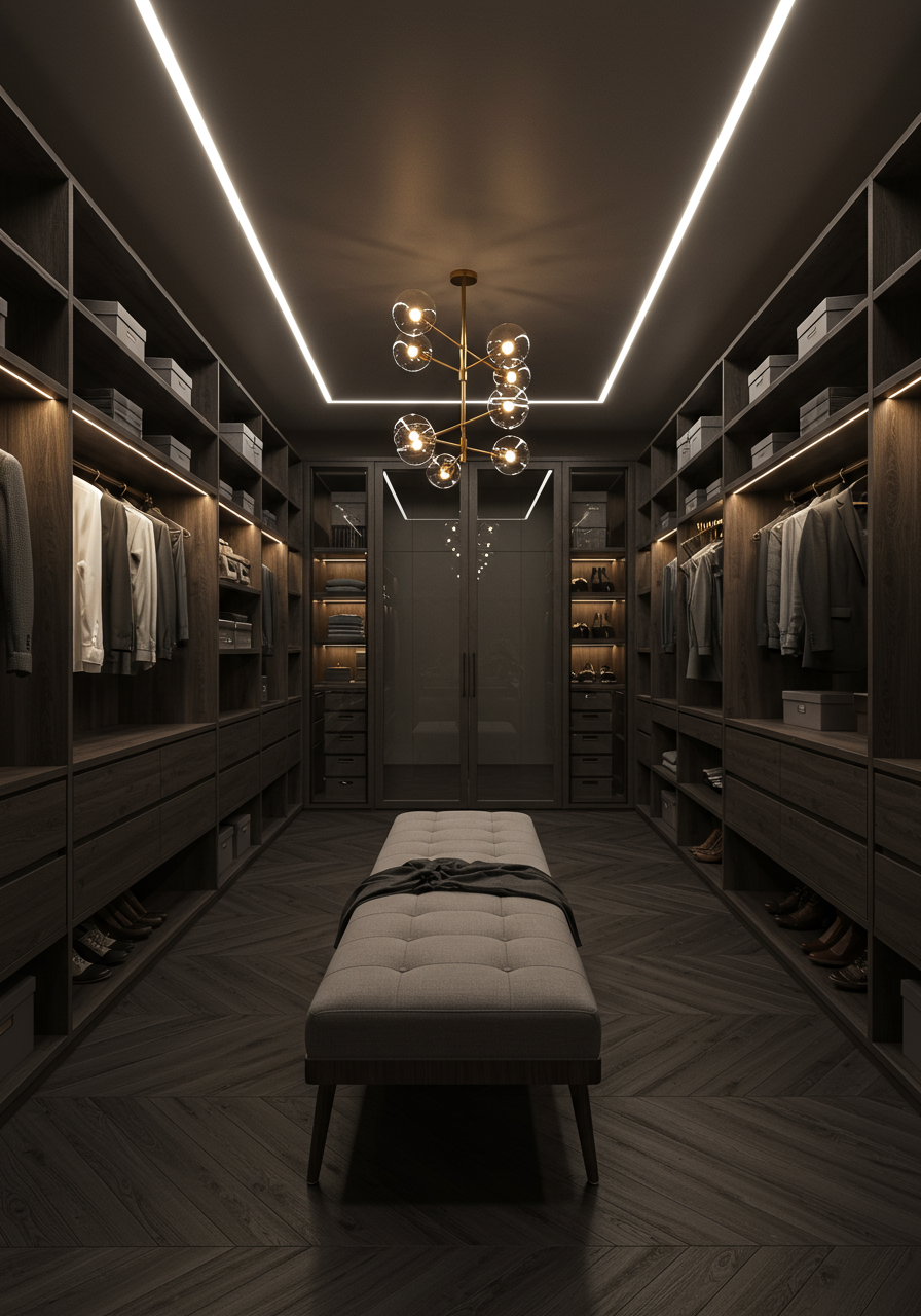 The primary suite’s Barneys-inspired, two-level closet.